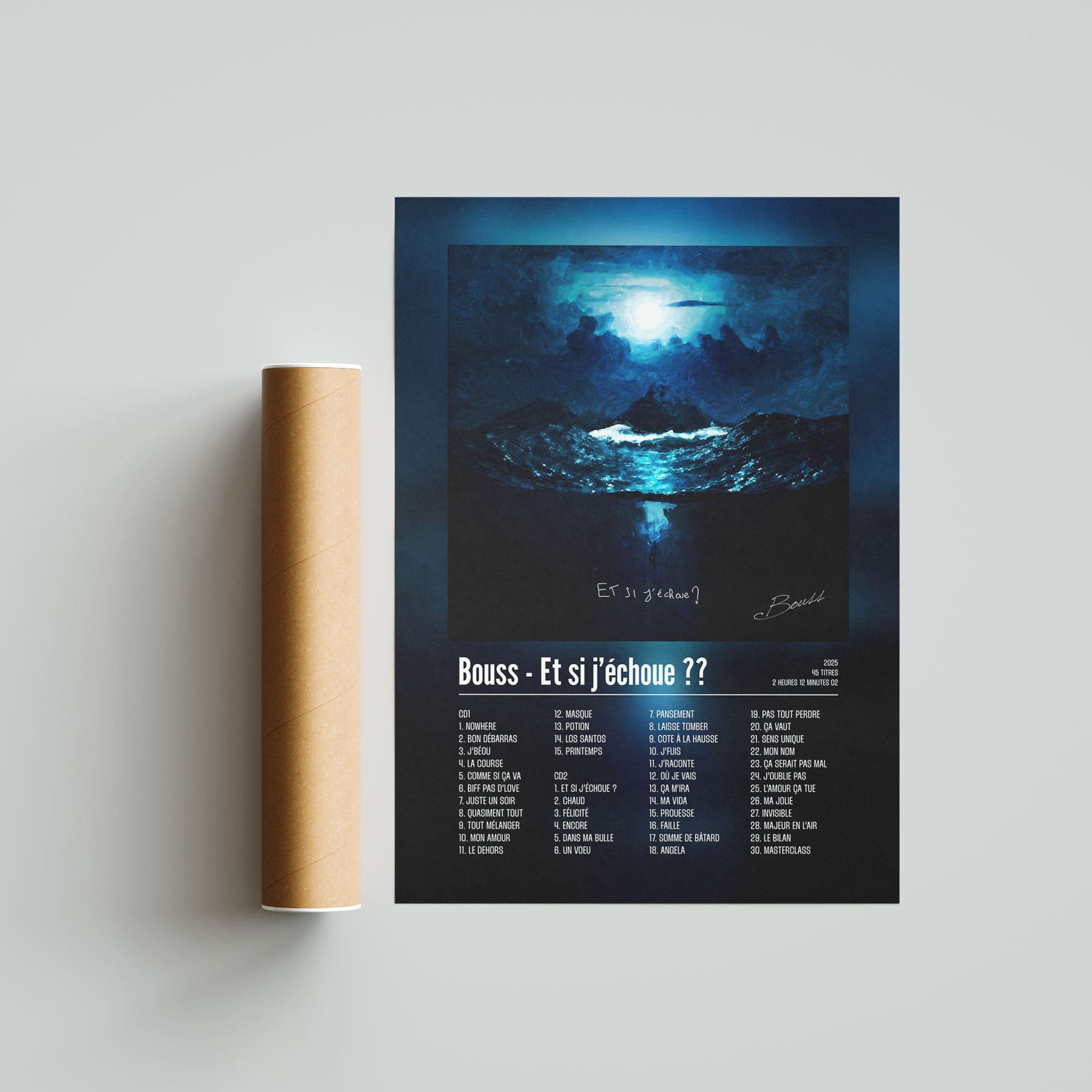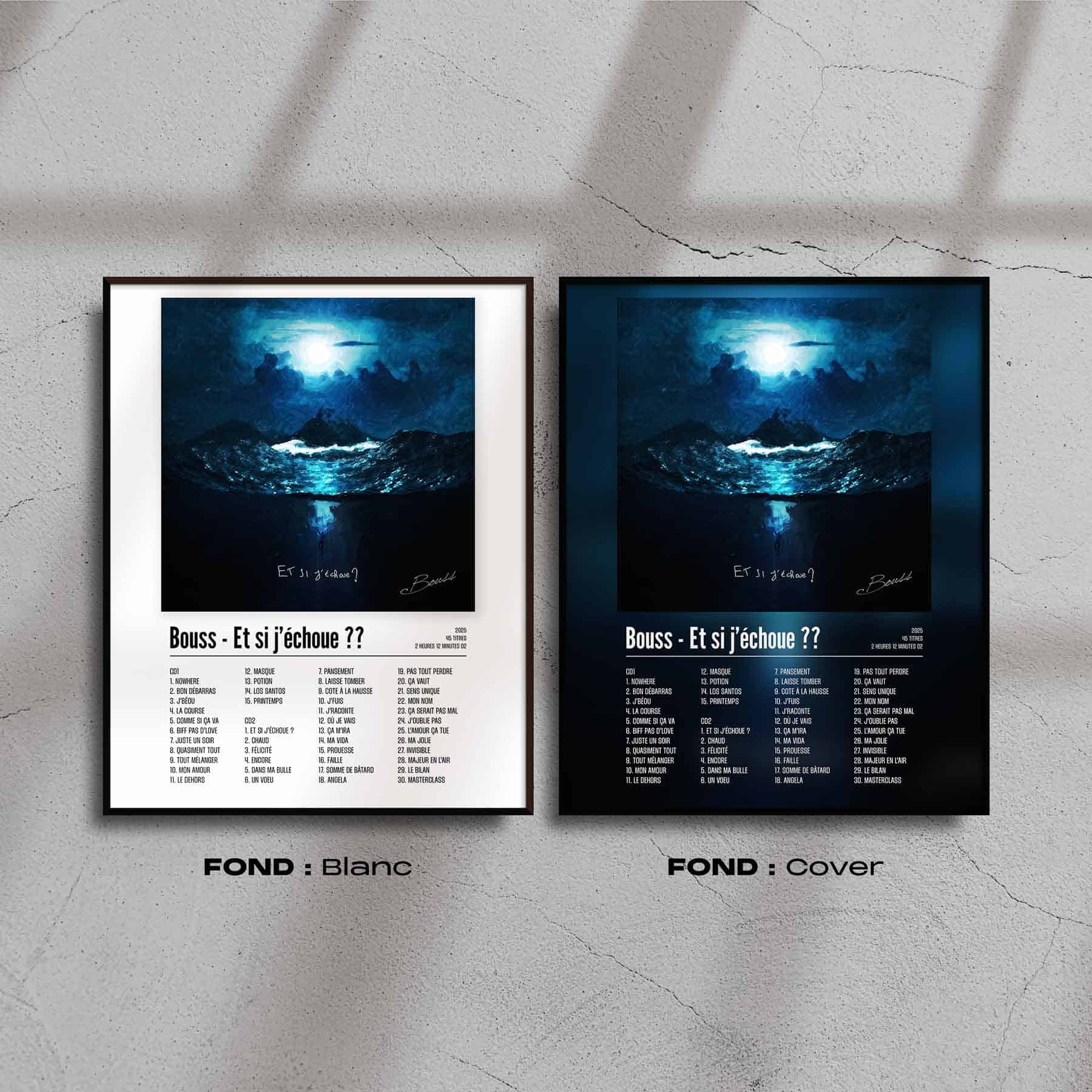L'album "Et si j'échoue" de Bouss en poster / cadre / affiche pour décorer votre chambre, votre salon ou n'importe qu'elle autre pièce ! Poster / cadre / affiche de rap français avec une impression de haute qualité, il fera toujours son effet. Idéal pour soi ou pour offrir. Apporte la fougue marseillaise directement sur ton mur.