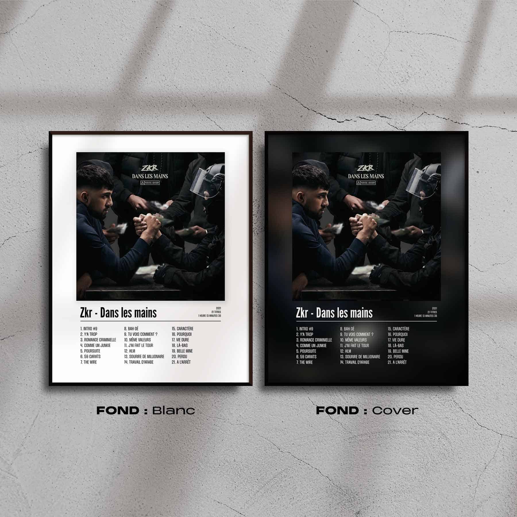 L'album "Dans les mains" de Zkr en poster / cadre / affiche pour décorer votre chambre, votre salon ou n'importe qu'elle autre pièce ! Poster / cadre / affiche de rap français avec une impression de haute qualité, il fera toujours son effet. Idéal pour soi ou pour offrir. Apporte la fougue marseillaise directement sur ton mur.